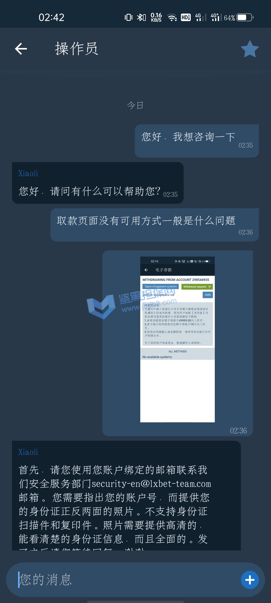 本人喜欢玩dt游戏,以前都是在龙8,乐虎优乐优发这些平台玩了几年,输了蛮多,前几天通过谷歌搜索dt游戏的台子,无意发现了一个推广站,所以2天时间,分别注册了22bet.1xbet betwinner.melbet一起4个台子,因为都有dt游戏,而且都是一个模板,我本以为是国际大公司,现在我极力认为这几个台子都是一家,首先我在1xbet充值2000后输了,而且未达到首存的流水,我就关闭了奖励账户,直接在充值2000,这次直接打到了7800,我试着去提款,但是不能提,客服说必须等到一个月后奖励账户流水限制自动关闭,然后我就没管了,晚上我又继续90一注玩dt游戏直接打到了10900元,也没管了,想着一个月后在去试着提款,同样是betwinner第一天充值4000元,这次我没有要首存奖励,输完了,第二天又充值了2000,这次70一注直接到了9800元,然后我想着去提款,因为betwinner没有银联充值取款渠道,我都是充值的usdt,所以我也直接打算提取usdt,尝试两次提取都是无法下发短信,然后我就试着联系在线客服,客服给我的第一句话就是,你现在想提款吗?然后神奇的一幕发生了,我的取款页面本来30几个提款方式的,变成1个都没有了,我登陆手机网页版本,直接取款页面都没有了,后面客服告诉我邮件联系安全部门,让我提供身份证正反,护照,还有手持身份证加安全部门邮件的合影,我都提供了,但是现在就没有消息了,在线客服给我答复意思就是要等3天之后等邮件,我从网上大致了解了这几个网站大多都说是黑网,我试着跟他们邮件说我不打算要盈利,只需要提款充值本金,现在也没有达到回复,还有就是我自从betwinner没有了取款选项,然后其他几个网站也同样没有了,毕竟我1xbet里面也有10900元,我联系1xbet好像也是要我联系安全部门,我心想着要1个月之后才能提款,就暂时没去发邮件。我不知道这些站什么情况,反正我玩了几年菠菜,还是第一次遇到黑网,所以请求帮忙联系交涉维权,就算盈利不要,我1xbet有4000,betwinner有6000充值本金,