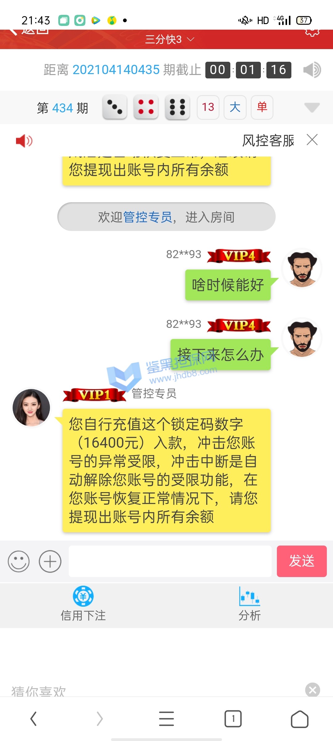 我是个线下低频彩庄家,主营线下福彩3D与体彩排列三的彩民投注,由于个人实力有限,每天会将一部分彩民投注打到盘上,本人保证所有注单都是真实彩民投注! 很早就有这家台子客服的微信,但没有尝试过投注,今年春节前,他家客服联系我,想合作,当时我明确表示低频彩由于玩法杂乱流水低赚钱慢,是一种在网上不受待见的彩种,但对方表示没关系,只要彩票站能买的,他那里都可以投注,于是就拿出了一部分投注到开心100了,也就发生了后面的不愉快! 4月4日晚,我正常投注,开奖后提款,很快就显示提款成功,但直到第二天都没有到账,客服以三方延迟为借口推脱,还诱骗我继续充值,但我没有继续上当,后来经过交涉,客服承认黑我钱,因为我赢了,他要降低损失,一共黑了我73360并注销了我的账号,希望大家擦亮眼睛,不要被这种黑台子诱惑,说的再多保障都没用,真黑你时候,你是找不到人的!另外要说明的是,由于低频彩封盘与投注时间非常紧张,所以本人经过与客服协商并得到他同意后申请了两个账号进行投注,不然忙不过来,每天我投注官方玩法,我员工投注传统彩玩法,绝非同平台对打套利,所有投注项目全部提前与客服协商过并得到了他的同意!恳请平台帮忙维权!