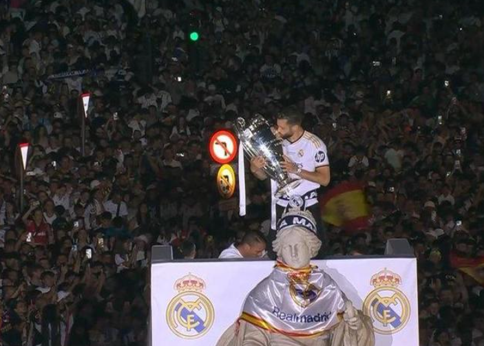 在西贝莱斯广场,队长纳乔为丰收女神系上皇马围巾,并且亲吻女神像。他说道:“非常感谢大家的欢迎。看到这里所有人的幸福面孔是我们能想到的最好的事情。我们永远不会厌倦胜利。HALA MADRID!”